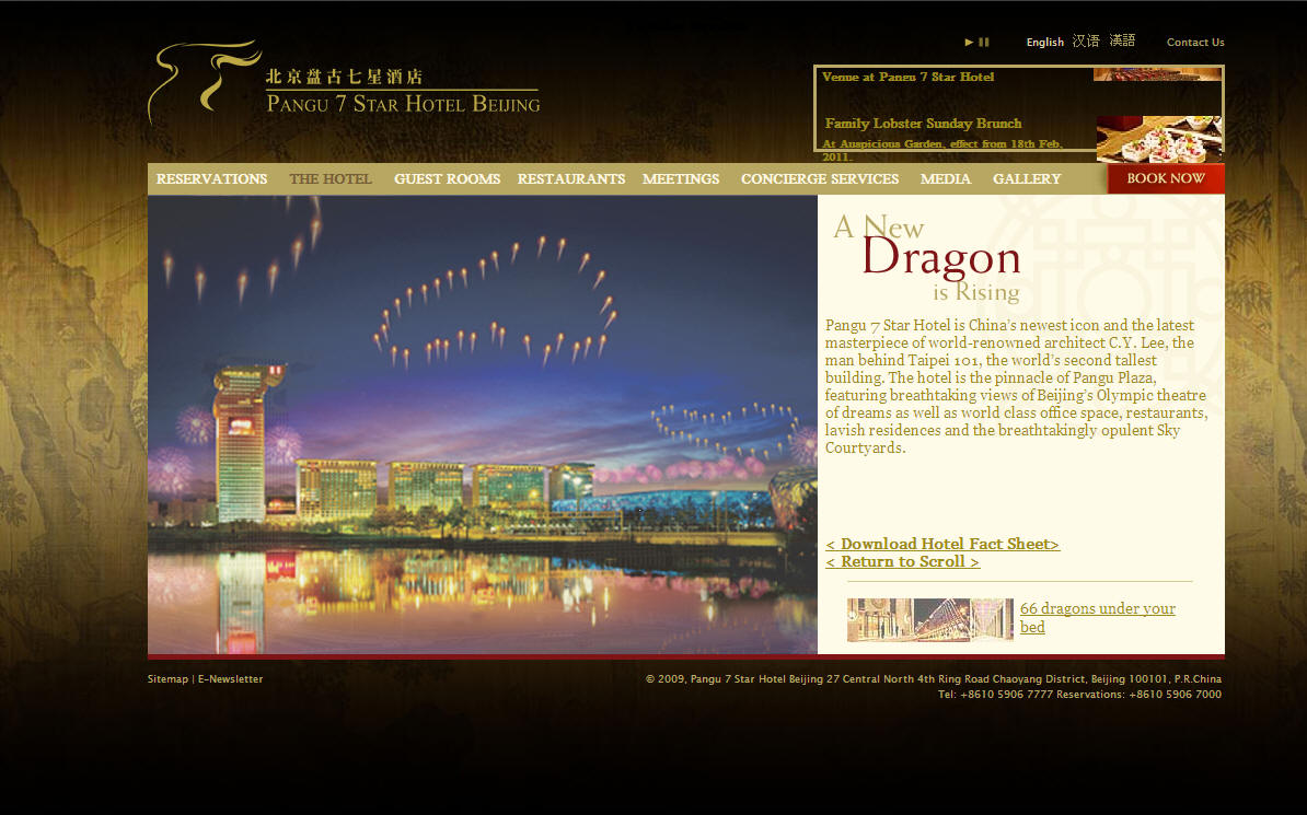 Pangu 7 Star Hotel is China’s newest icon and the latest masterpiece of world-renowned architect C.Y. Lee, the man behind Taipei 101, the world’s second tallest building. The hotel is the pinnacle of Pangu Plaza, featuring breathtaking views of Beijing’s Olympic theatre of dreams as well as world class office space, restaurants, lavish residences and the breathtakingly opulent Sky Courtyards.