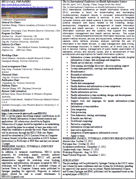 The 4th International Conference on Health Information Science (HIS 2015) provides a forum for disseminating and exchanging multidisciplinary research results in computer science/information technology and health science & services. HIS 2015 aims to integrate computer science/information technology with health sciences & services, embracing information science research coupled with topics related to the modelling, design, development, integration, and management of health information systems and health services. It covers all aspects of the health information sciences and the systems that support this health information management and health service delivery.